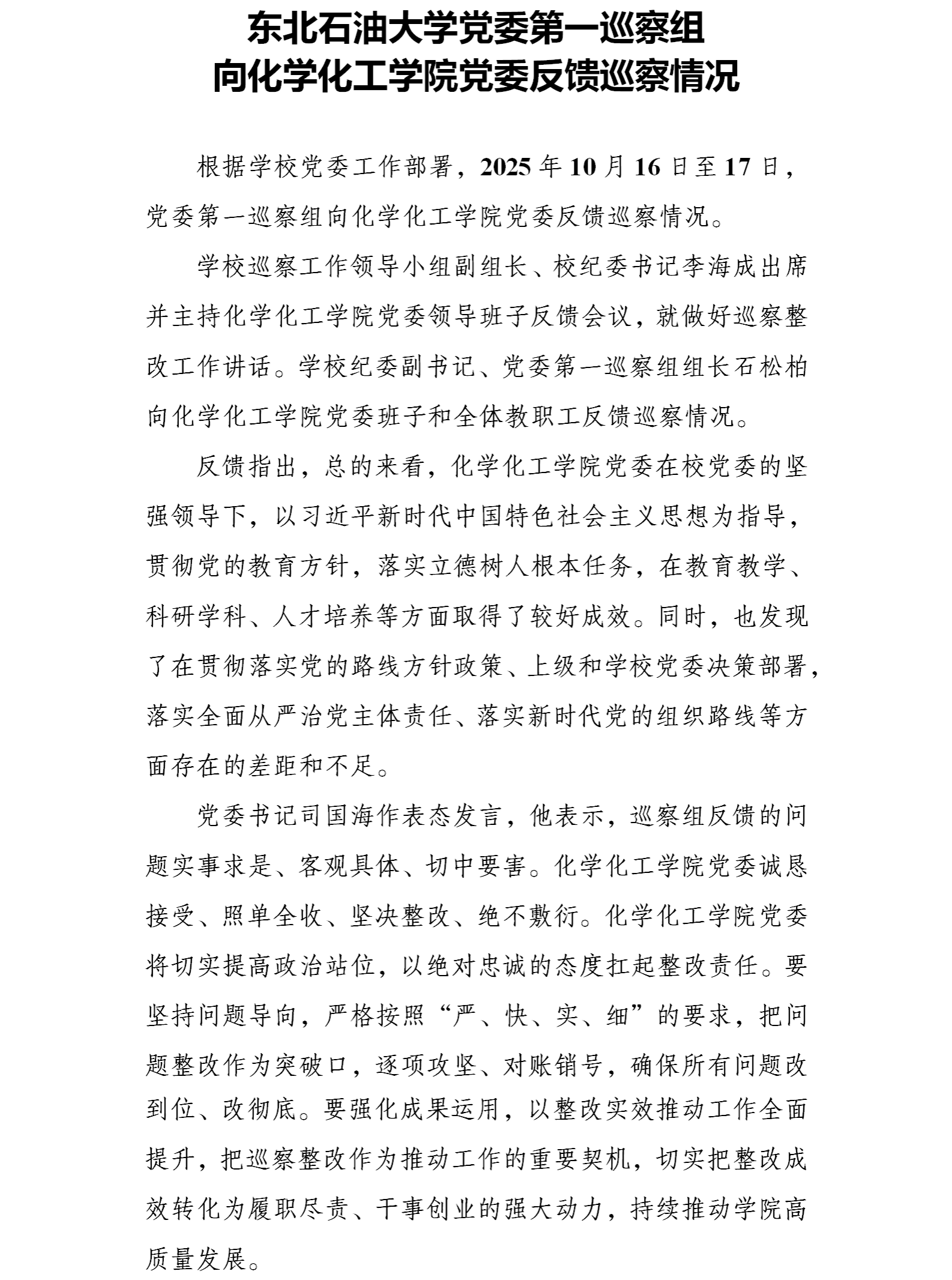 东北石油大学党委第一巡察组向化学化工学院党委反馈巡察情况