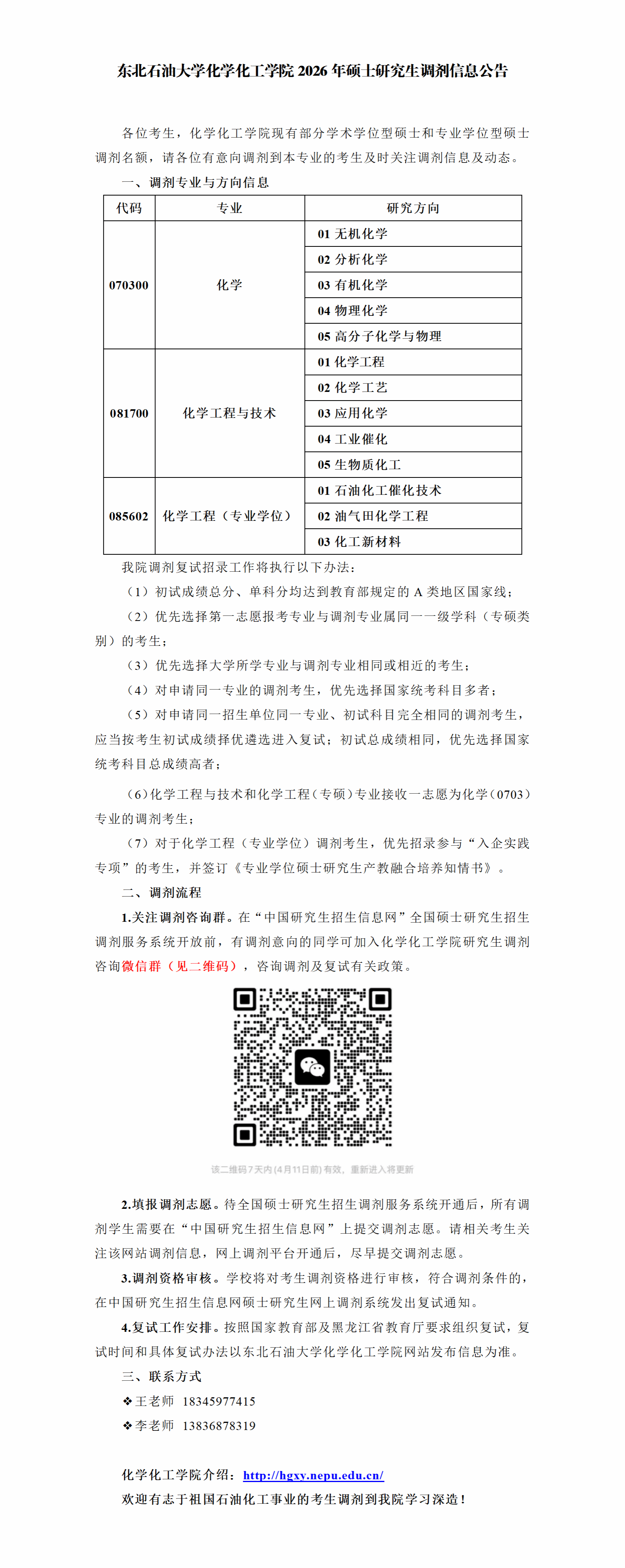 东北石油大学化学化工学院2026年硕士研究生调剂信息公告