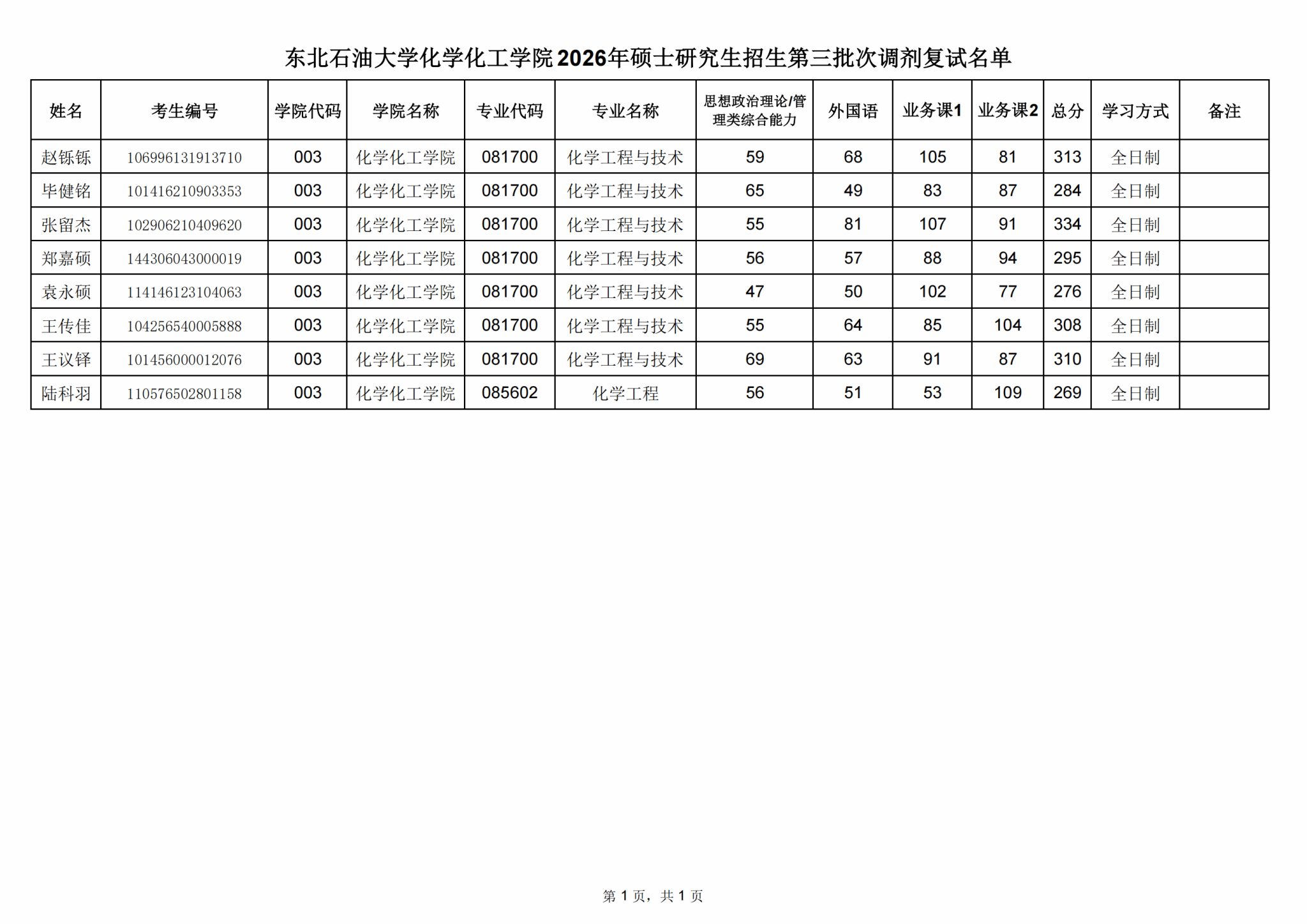 东北石油大学化学化工学院2026年硕士研究生第三轮次调剂复试成绩公示